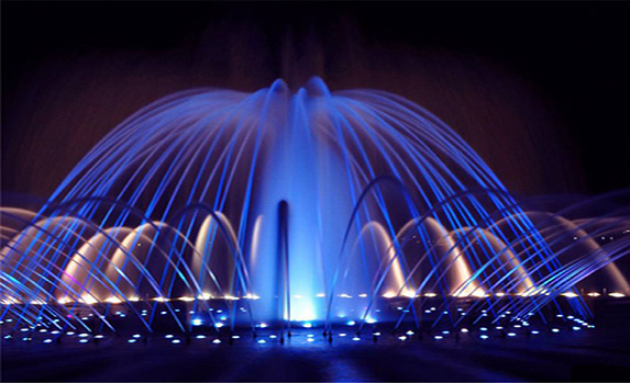 沿著設(shè)定的軌跡噴射,弧形波光水線穿池而出,在空中掛起一道道幽雅的彩虹。單而高
